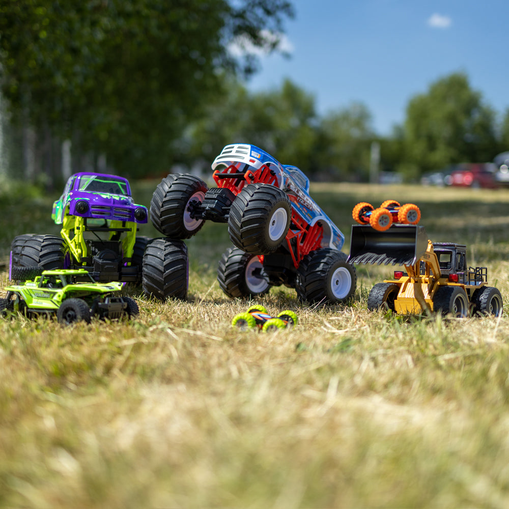 Det kommer helt an på bilen og græsset! En god tommelfingerregel er, at de mindre biler med små hjul har det svært i højt eller tæt græs – de har simpelthen ikke frihøjde og kraft nok til at komme frem. Hvis du primært vil give den gas på græsplænen, skal du kigge efter en af vores større modeller, som en Monster Truck eller en bil med firehjulstræk og store, grove dæk. De er bygget til at erobre ujævnt terræn og elsker en udfordrende tur i haven. Se fx Quakeshock og Rustler - eller alle bilerne fra Traxxas.